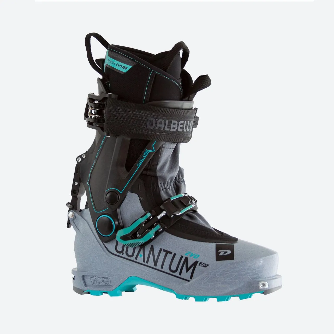 The Quantum EVO W with 99 mm last has an edge over other boots because of its innovative, two-part shell and shaft construction and its anatomical fit. It combines an extremely tough, stiff outer shell including a continuous sole plate with maximum freedom of movement for ascending. Carbon-reinforced polyamide increases the structure’s rigidity. An optimised centre opening with a stretchy gaiter makes it easy to get the boot on and off despite the hardness. Low weight and a two-piece EVO Dual Link shaft with a 65° range of motion makes ascending easier. Once you’re up the mountain, simply close the slightly raised shaft with shin padding using the Hike & Ride buckle and Velcro power strap, giving you a great fit and optimum power transmission. The wide Velcro strap has a memory function and quick release, and only has to be set once. The shell material is extremely stiff, which means your steering signals are transmitted to the ski fully and instantly, giving you the best possible performance and ski control. A very light, multi-layer ID touring liner with AUTOFIT padding guarantees firm heel support, warmth and wonderful comfort. The Quantum EVO W features MyFit technology, so it can be adjusted to each foot individually. A treaded Vibram sole (rocker) with graded hardness helps the boot hold firm in snow and when climbing, and transmits power to the binding and ski without any play at all.