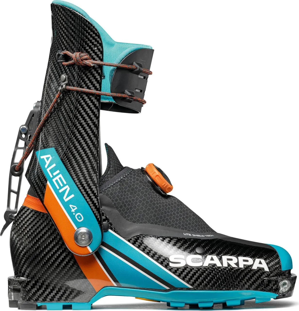 The Alien 4.0 is a full carbon ski boot developed with our top athletes for skimo races. The anatomical shape of the shell guarantees a comfortable fit and the rockered shape ensures perfect energy transfer to the ski. The integrated gaiter prevents snow from penetrating the shell during the ascent and descent. The BOA® Fit System provides a stable and adjustable closure without pressure points. To get the most out of your ski boots, we recommend that you have the inner shoes thermoformed at a dealer from the SCARPA network.