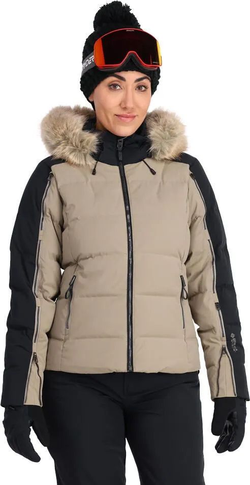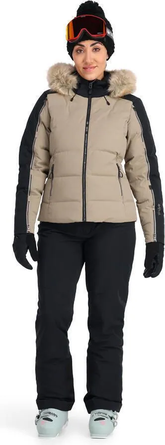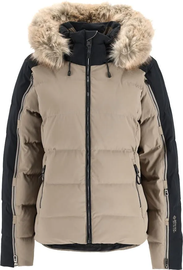 Luxury design, 4-way stretch fabric, and the unparalleled warmth of down defines the Falline Down Jacket. GORE-TEX provides the ultimate in weather protection and 650-fill goose down serves up lofty warmth for colder days. Exclusive to the Falline, elegant Metaluxe® zippers down the arm serve as vents, data card pocket and sleeve cuff extension. Fashioned with a removable hood and powderskirt, this sophisticated style is versatile enough for on- piste and around town.