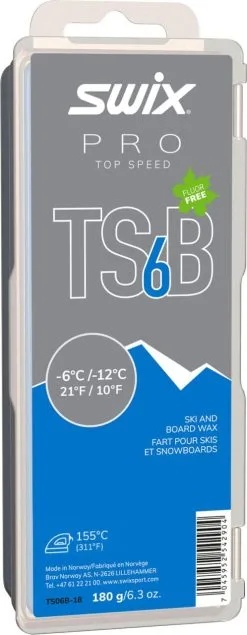 TS6B is the second hardest wax in the TS line and is an excellent choice under typical winter conditions, both for cross-country and alpine skiing. It is a favorite among service personnel due to its superior durability and excellent glide performance on dirty snow. This is achieved by new additives that also reduce friction on very cold snow. Despite being a wax for cold conditions, its melting point makes it easier to apply than many similar waxes in this area, without compromising its glide properties. The speed of the waxing iron should be approx. 8-10 seconds for a skating or alpine ski. The wax can be reheated after cooling to room temperature (10 min.) for better durability. Scrape after waiting about one minute. It is important to have a good waxing iron in order to melt the wax efficiently. TS6B can be used as a racing wax alone or as a base wax for other racing products. Recommended waxing iron temp.: 155°C.