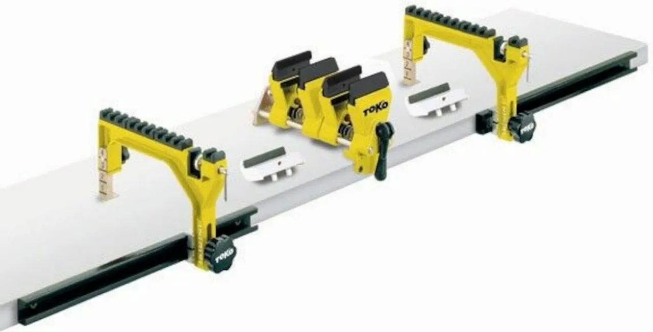 Professional device with adapters for clamping different skis and snowboards. It can be clamped 2 skis at the same time. Optimal for the workshop area.