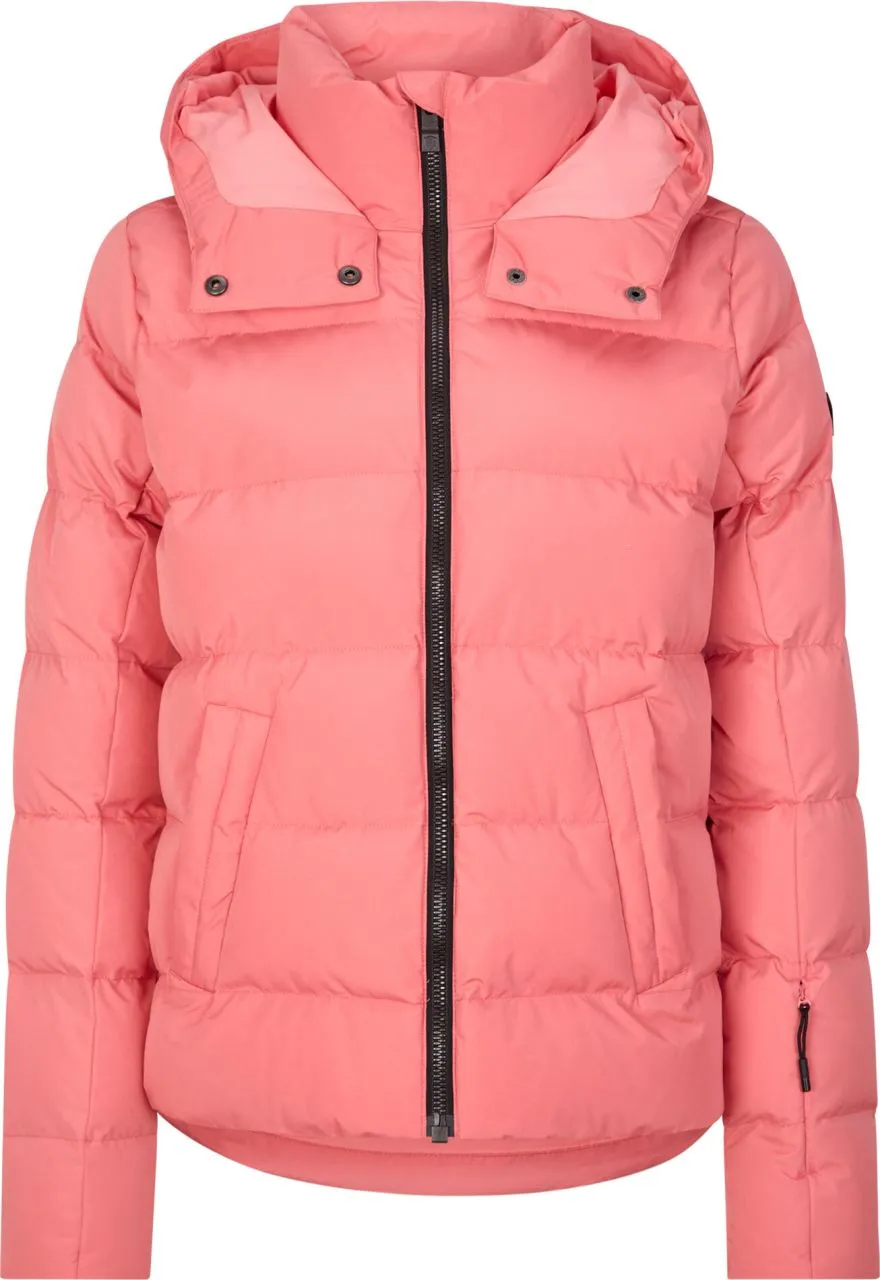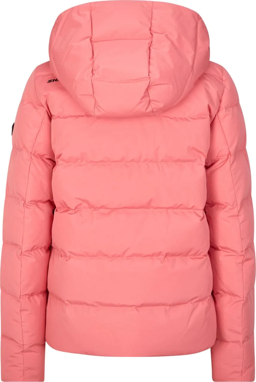 - The warming, fashionable ZIENER women’s ski jacket TUSJA LADY with light A shape is characterized by the washable, environmentally friendly CLOMAX® HALO MicroDown aus. This ensures outstanding thermal performance, while being compressible to a small size and highly shape-retaining. The breathable, waterproof and windproof ZIENER AQUASHIELD® membrane (water column 10,000mm/breathability 10,000g/m²/24h) offers a warm and dry climate. Thanks to the environmentally friendly impregnation, the jacket is PFC free. The extra high, cozy collar can be buttoned – it contributes to the high functional comfort and modern look of this ski jacket. Comfortable inner sleeve cuffs and an elastic lining offer optimal freedom of movement. A side ski pass pocket and a removable snow skirt make this jacket the perfect companion for a day on the slopes. An inner pocket for ski and sunglasses as well as the pocket for smartphones offer space for the most important things.